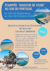 Accompagnés par Véronique Damez, explorez les clés de l’autohypnose chaque matin et apprenez à cultiver votre paix intérieure. Laissez ensuite la magie de l’Algarve opérer : avec des après-midis libres et deux journées de totale évasion, ce séjour est imaginé pour ceux qui souhaitent retrouver leur équilibre intérieur dans un cadre d’exception.